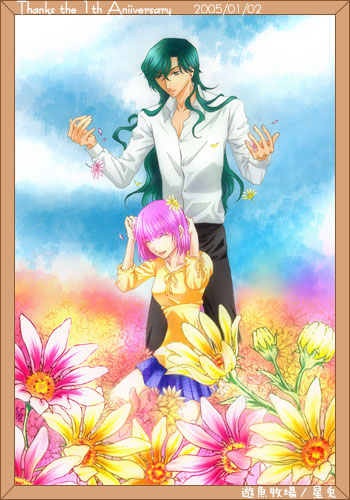 サイト一周年記念作品としてフリー配布されていたものを頂戴して参りました。 『遙か』より友雅さんとあかねちゃん。 オフラインで立込んでいる時期と伺っていたので、記念作―しかもこんなに素敵な物が配布されるとは、思いもよらず…。 発見した時には、即保存したのは言うまでもありません。 お祝いに通ずるような温かで陽気に包まれたこの二人の世界観。 龍神の祝福を感じますね〜。一面の花に包まれた様は、まさに楽園そのもの。 無邪気なあかねちゃんの様子をみたいばかりに!?、いつになく はしゃいで見せる友雅さんの様子に心和みます。 鮮やかで、でも煩くない綺麗な色合が、春爛漫としていて見る側も幸せな気分です。 |