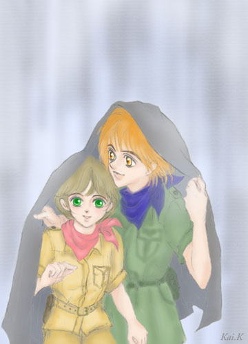 背景の雨の雰囲気も綺麗ですし、被り物の布が同系色なので、 中に居る2人に自然と目が吸い寄せられる、素敵な配色vvv